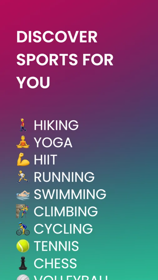• Say goodbye to endless searching and Hello to instant connections. Our app automatically matches you with fitness people based on location and preferred activities, so you can get moving right away!