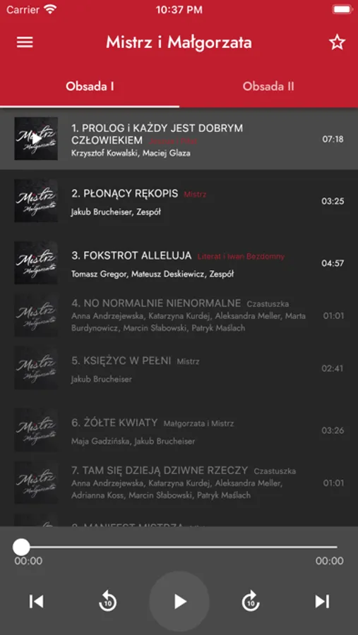 - dostępne zakupy w aplikacji - po dokonaniu zakupu użytkownik uzyskuje dostęp do wszystkich utworów ze spektaklu