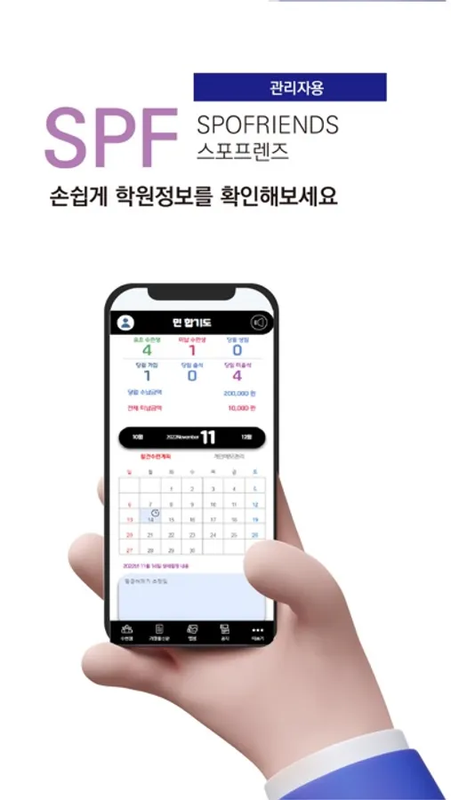 스포프렌즈는 태권도장 관장님을 위한 도장내 전반적인 관리를 편리하고 손쉽게 사용할 수 있는 관리시스템, 관리자APP을 제공합니다.