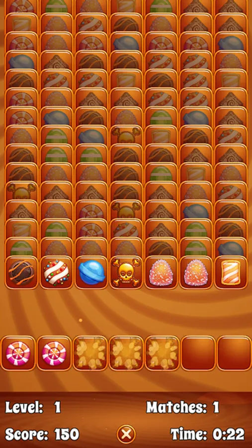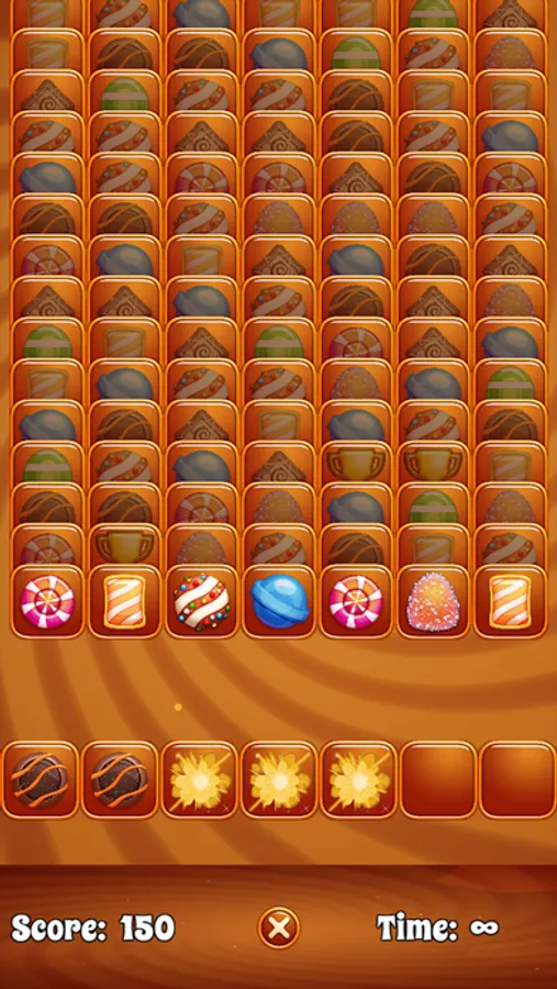 Tap a candy to send it to the game board below. Match three candies to remove them from the board. Keep an eye out for trophy pieces that act as wildcards, but beware of hazard pieces that must be matched with other hazard cards to remove them!
