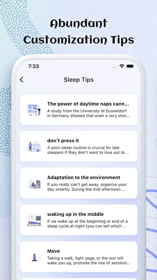 2. Abundant Customization Tips - A large number of rest suggestions customized for you based on your sleep cycle registration information, daily schedule and mobile phone usage frequency.