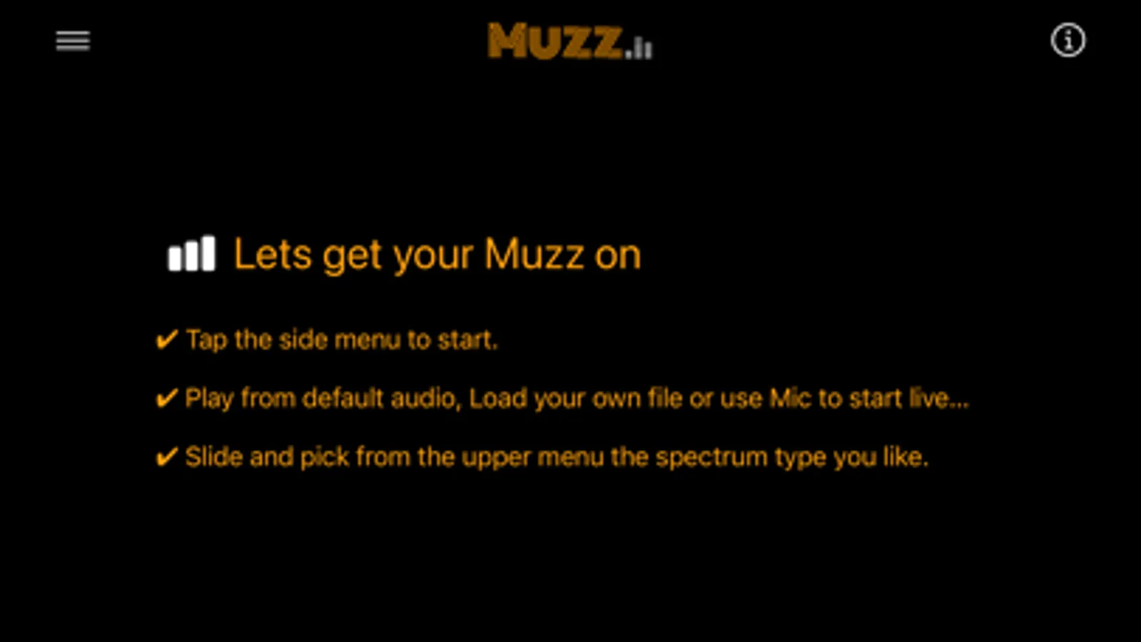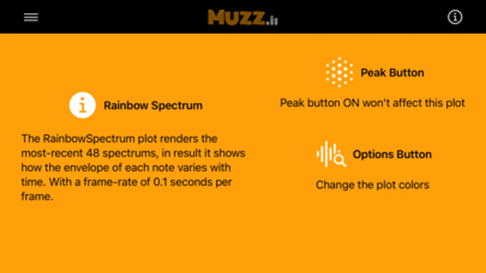 The purpose of Muzz is to help audio technicians, beginners and experts, to analyze any audio signal and to understand the characteristics of the spectrum fundamental, harmonics, feedback, etc. This is achieved by providing a set of 21 different spectrum analyzers to visualize audio data. For in-depth theoretical information on each spectrum graph you pick, just click on the info icon.