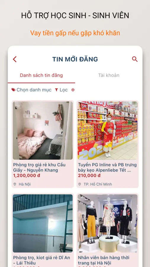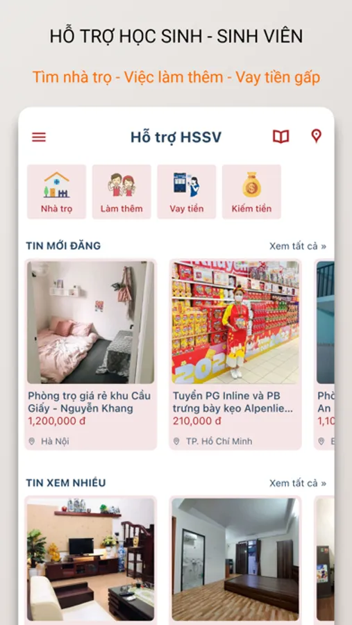 * Hỗ trợ học sinh/sinh viên toàn quốc tìm nhà trọ/phòng trọ, việc làm thêm, tự kinh doanh/kiếm tiền hoặc vay tiền gấp.