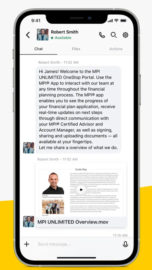 Use the MPI App to interact with our team at any time throughout the financial planning process. The MPI app enables you to see the progress of your financial plan application, receive real-time updates on next steps through direct communication with your MPI® Certified Advisor and Account Manager, as well as signing, sharing and uploading documents — all available at your fingertips. After your plan is in place, the MPI app will be your one-stop shop for all communication and plan maintenance requests and will also have resources to answer common questions and provide helpful links to keep you informed.