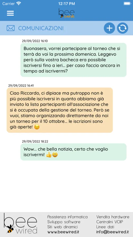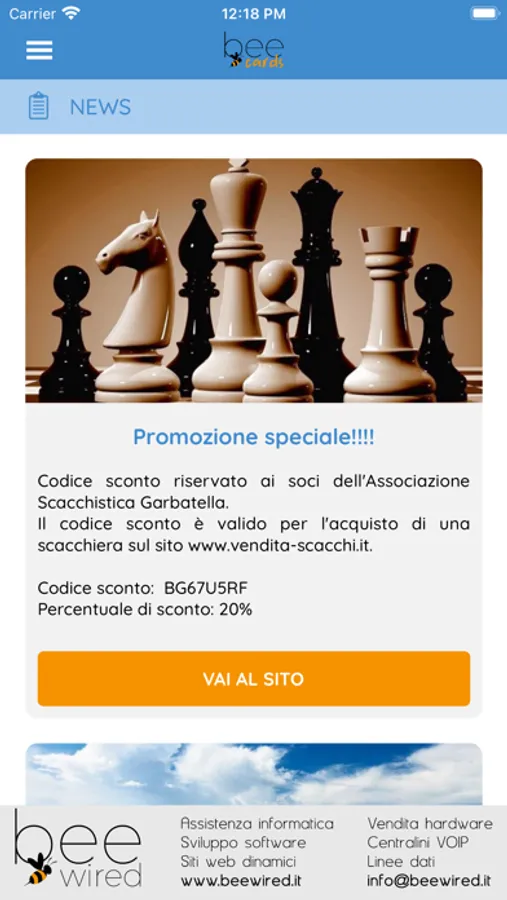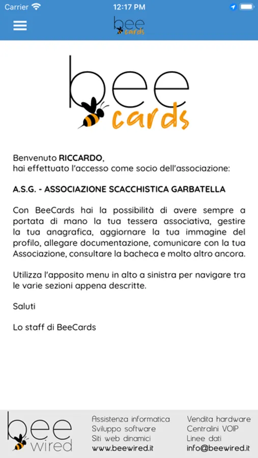 L'applicazione BeeCards è stata creata ed ideata per i soci delle Associazioni iscritte a BeeCards ed è ad essi riservata, consentendogli di avere sempre a portata di mano la propria tessera associativa, di aggiornare la propria anagrafica e la foto profilo, di inviare alla propria Associazione tutta la documentazione necessaria (documenti d'identità, certificati, licenze, ecc.), di comunicare direttamente con la propria Associazione, di essere sempre aggiornato sulle novità proposte dalla propria Associazione e molto altro ancora.