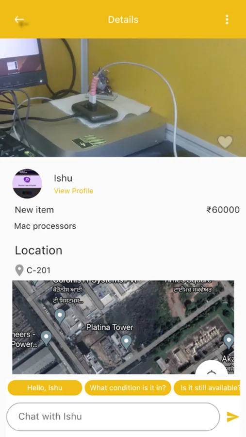This app is designed to sell and buy the products. It has map feature to see the near by products over it.It has other various features like chat & settings. A user can check the profile of the seller.