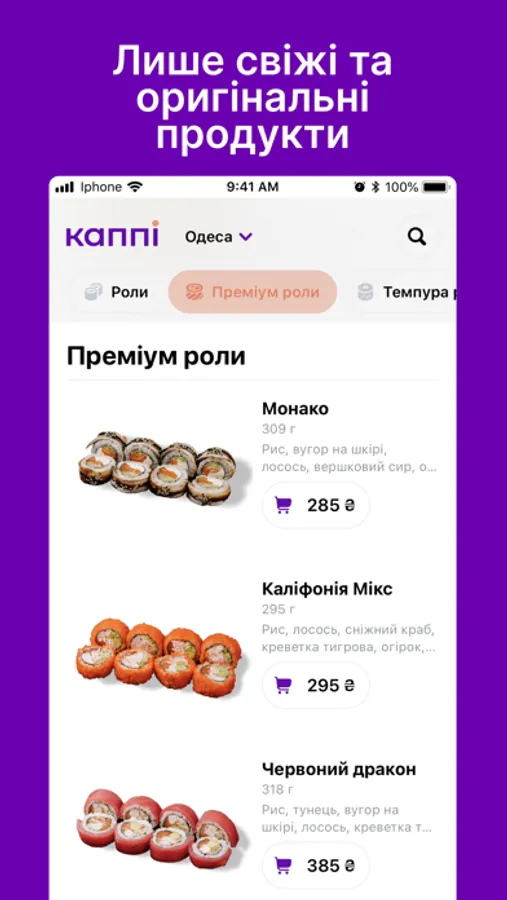 Каппі - сучасна доставка їжі в місті Одеса. І як же круто, що у сучасної доставки з'явився супер сучасний додаток! Відтепер можна замовляти улюблені роли та піцу в декілька кліків, отримувати з кожного замовлення бонусний кешбек та слідкувати за статусами доставки в режимі онлайн!