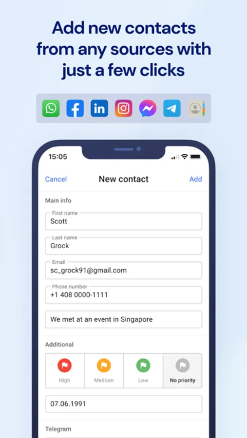 - Ordemio lets you seamlessly gather and add new contacts in seconds from Phone Contacts, Email, WhatsApp, Telegram, Messenger, LinkedIn, Instagram, Facebook, and etc.