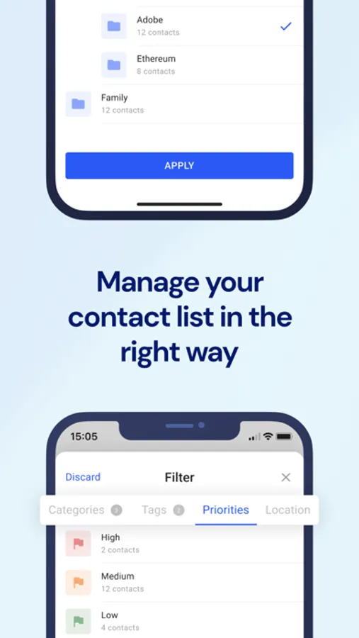 - Manage your contact list in the right way. With features like categories, tags, location and priority, you can easily organize people in ways tailored to your needs.