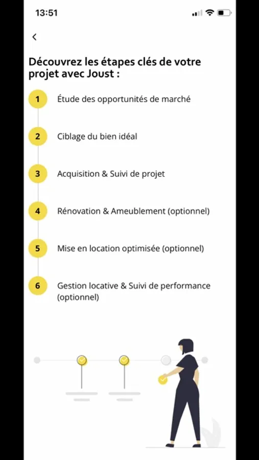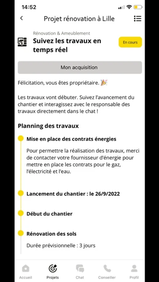 Suivez chaque étape en temps réel sur votre application : recherche, acquisition, rénovation, ameublement, mise en location