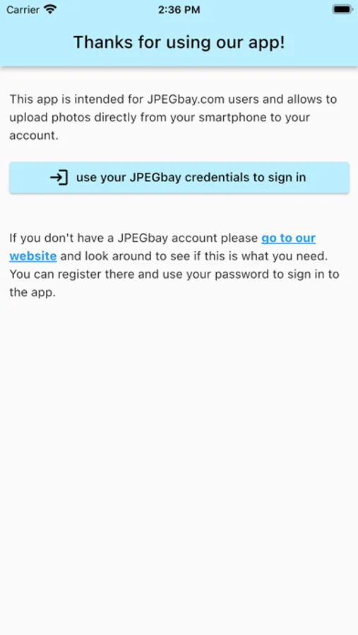 This simple app is intended for JPEGbay.com users and allows to upload photos directly from your smartphone to your web account.