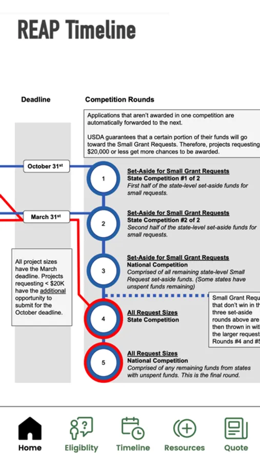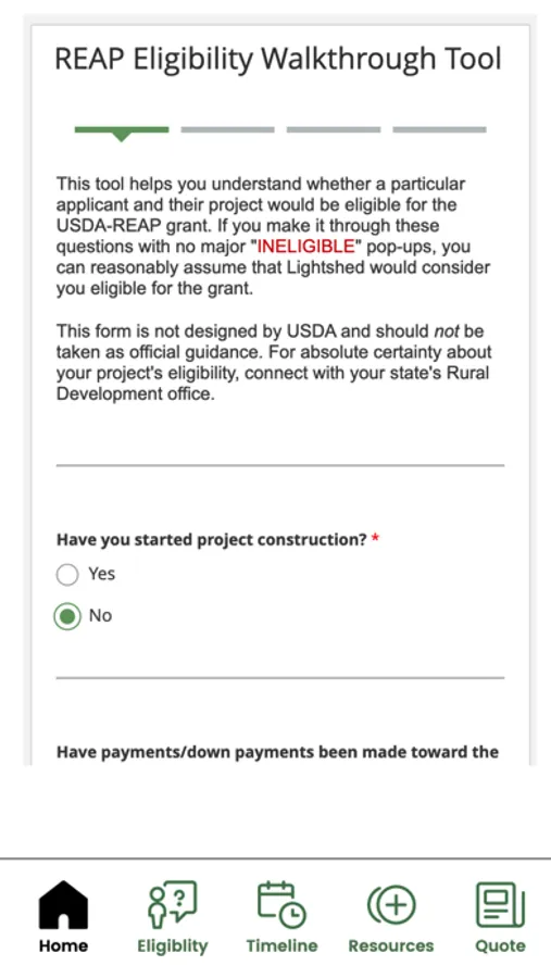 Navigate the ins and outs of the USDA Rural Energy for America Program (REAP). Designed for energy installers and their rural business applicants to assess project eligibility, determine their project's funding timeline, and connect with grant writing experts.
