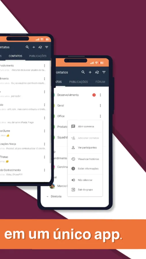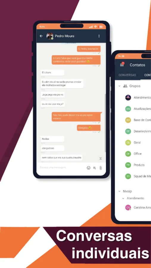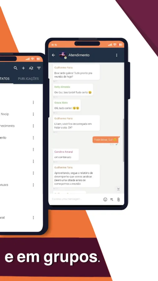 - Converse com seu time por grupos ou individualmente no seu celular;
