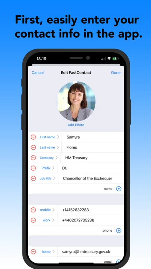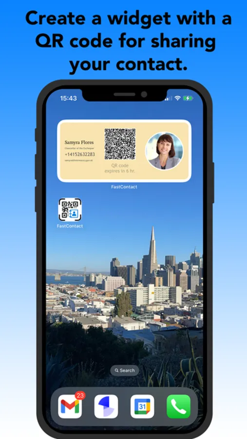 FastContactApp.com makes it super easy to share your contact information. Enter your contact information with a simple, familiar interface. Then create a business card design and add it as a widget on your phone. The widget will contain a QR code. When someone scans the QR code, your contact information will pop-up and the user will be presented to add the card to their contacts directly. And they don't need the app for this to work.