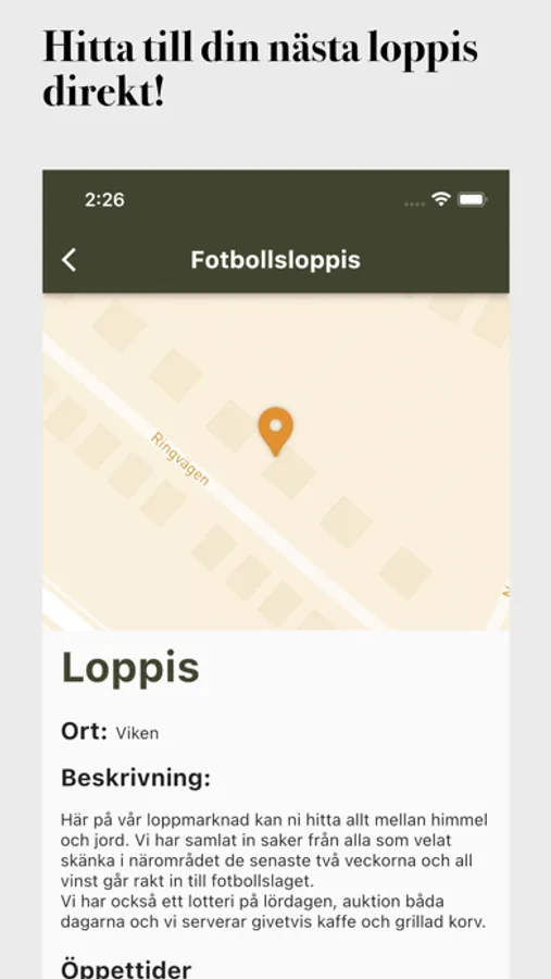 Med Loppisletarn får du alla Sveriges loppisar i din ficka, helt gratis. När det är dags att planera nästa loppisrunda hittar du enkelt vilka loppisar som har öppet i ditt närområde. Alla loppisar har också en knapp så du enkelt kan använda din telefon som GPS för att navigera rätt, sen är det upp till dig att navigera bland fynden.