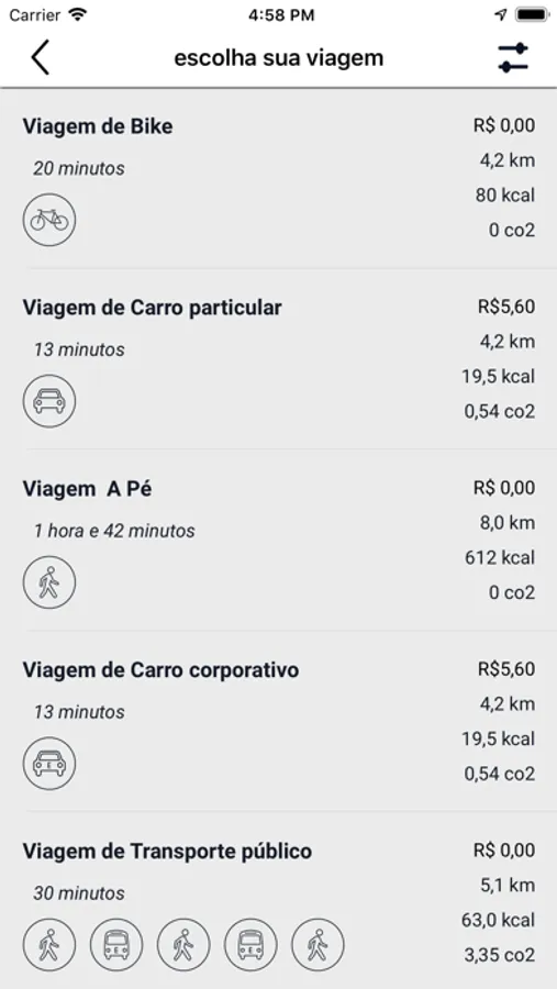 No Simcorpi o usuário escolhe sair de casa a pé, de bicicleta ou de carro, e o aplicativo oferece alternativas de carona, transporte público, carros corporativos, vans, fretados, ou trajetos multimodais, otimizando o aproveitamento e a eficiência dos recursos disponíveis.