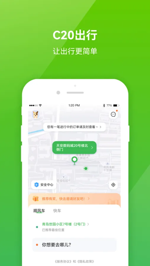 C20出行是天津华时科技有限公司打造的智慧出行生态平台,兼具多种功能的出行之选。2021年1月获得国家七部委批准颁发的合规网约车运营资格证,同期获取国家下发的国牌牌照。