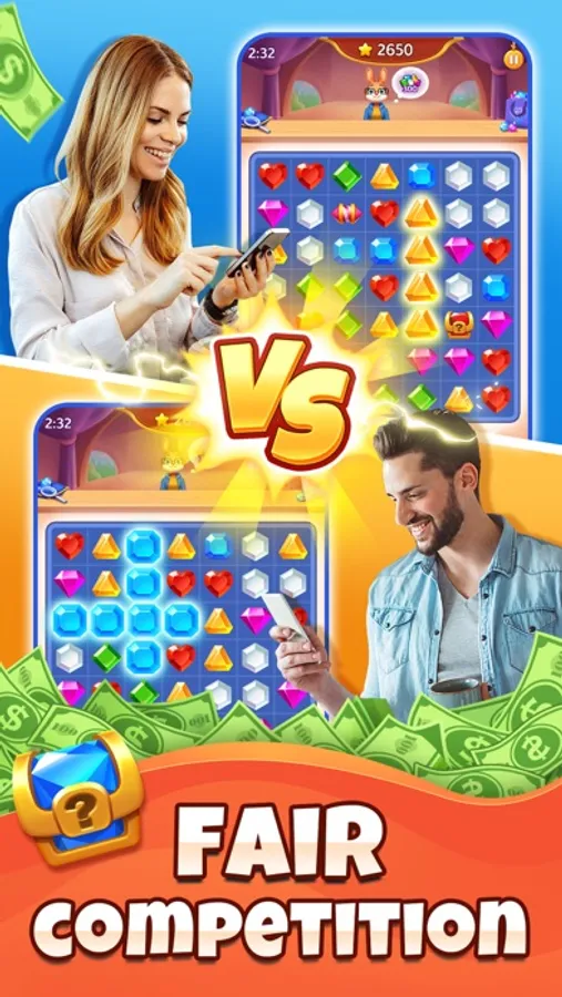 Compete in Jewel Party - Win Real Cash with real-time players! Matching against opponents with comparable skill level, 100% fair in every match, super exciting in every game! Time to match gems & score higher points and win the real cash!