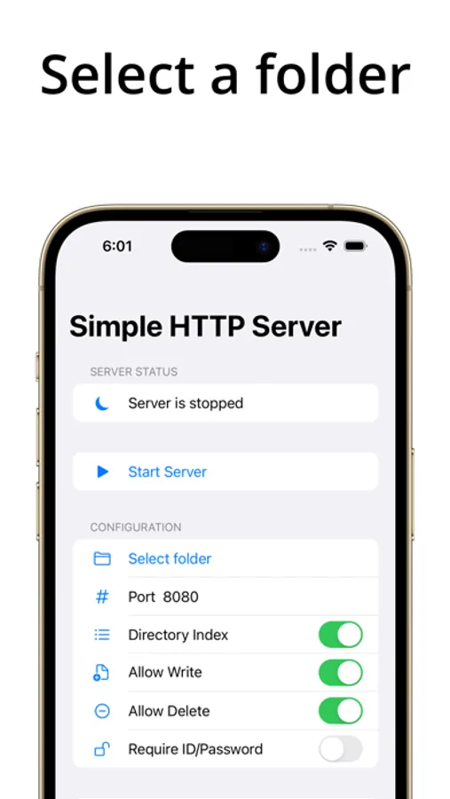 1. In the app, tap "Select folder" and select a folder to be shared. You can choose a folder on your device or iCloud.