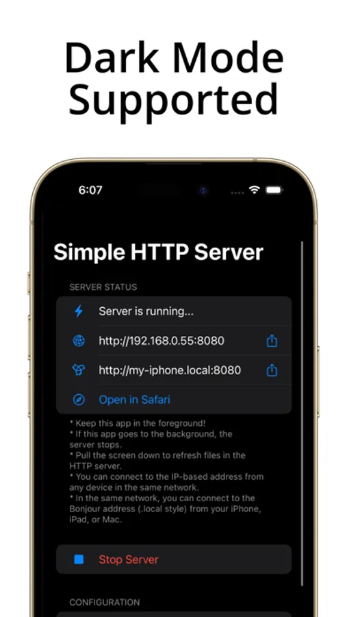 - Simple HTTP Server should be running in the foreground. It cannot be run in the background. If you change to another app or turn off the screen, the web server will stop.