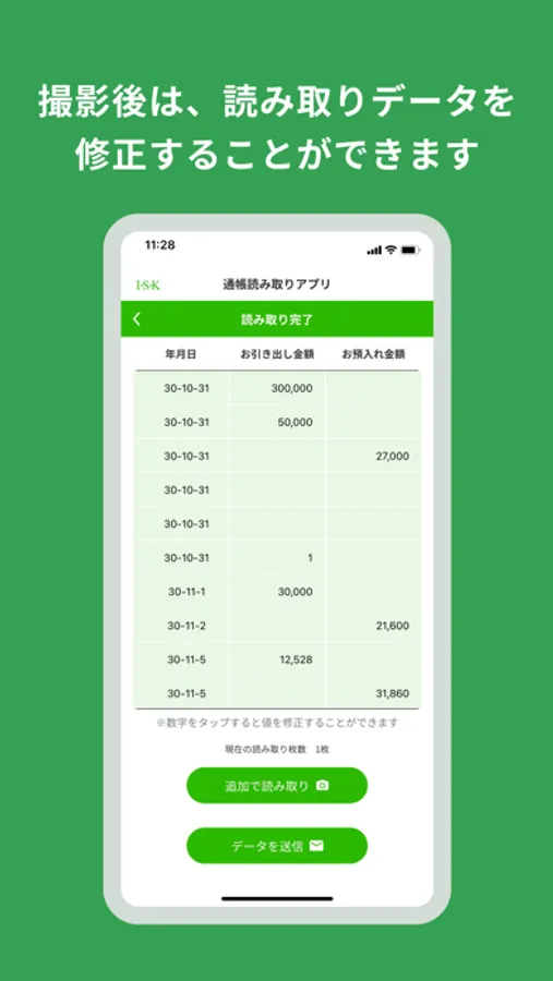 今回、通帳の画像データから内容を読み取り、日付、金額をデータ化することに成功しました。(特許出願中)