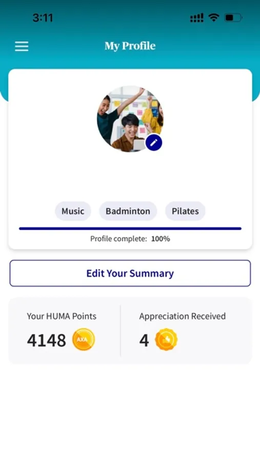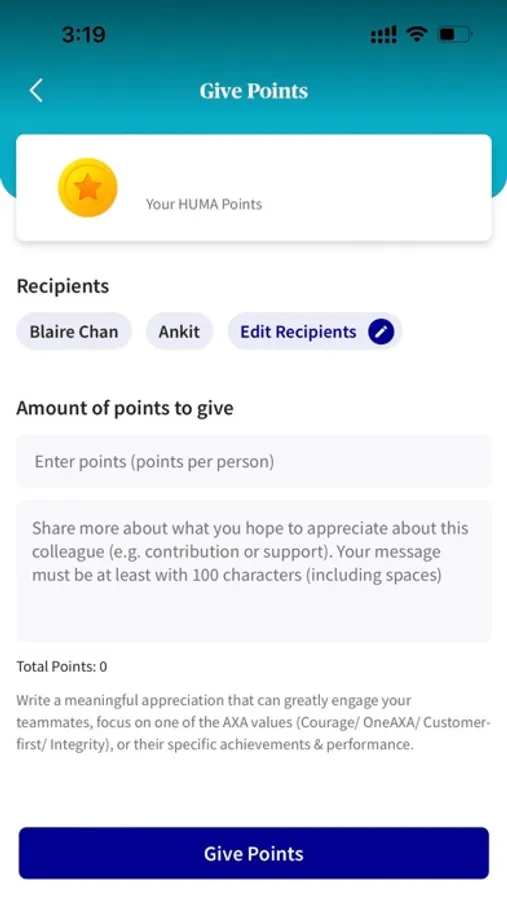 • Point system: Give or collect HUMA points from various activities e.g. profile set-up, giving and receiving appreciation