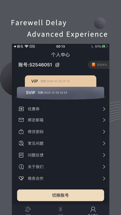 畅玩各种手游、访问各大音乐平台,短视频超清直播、高清视频随便刷。银行级专业线路更稳定,一键加速网络,无需配置。一个账号支持多终端登录,多台设备可同时享受在线加速。