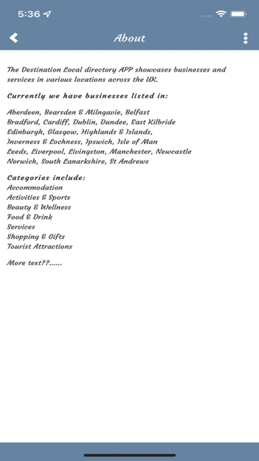 Download directory APP showcasing businesses and services in locations across the UK. Categories include; Accommodation, Activities & Sports, Beauty & Wellness, Food & Drink, Services, Estate Agents, Professional Services, Trades, Travel, Vehicles, Shopping & Gifts, Tourist Attractions