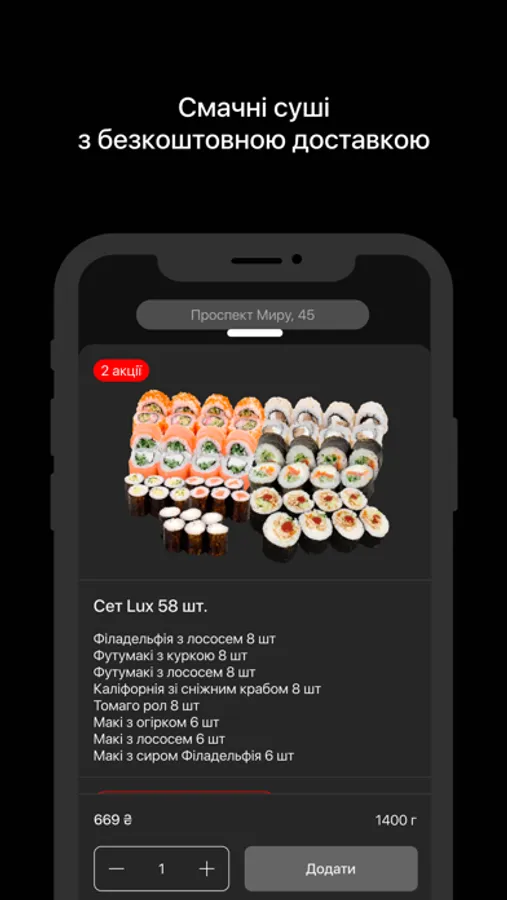 Завантажуй наш додаток, обирай місто та замовляй свої улюблені суші, піцу чи локшину зі швидкою доставкою в твоєму місті! Замовити їжу з нашим додатком можна швидко та просто! Завантажуй!