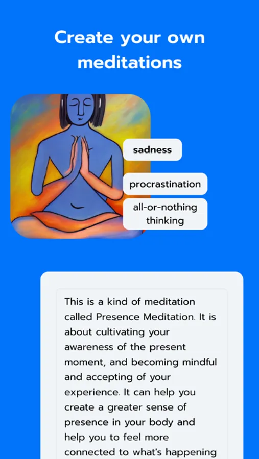 Our AI meditation teacher allows you to create your own meditations based on your mood journals and bodily sensations. This helps you to relax, recalibrate and gain clarity in challenging situations, while focusing on positive and long-term changes.