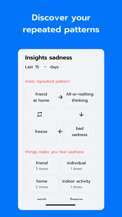 Neo therapy uses journal logging to help you discover and recognize repeating patterns in your life. It provides tools to analyze your entries and gain deeper insights into your emotional wellbeing. This helps to identify the patterns that bother you or patterns that bring joy to your life.