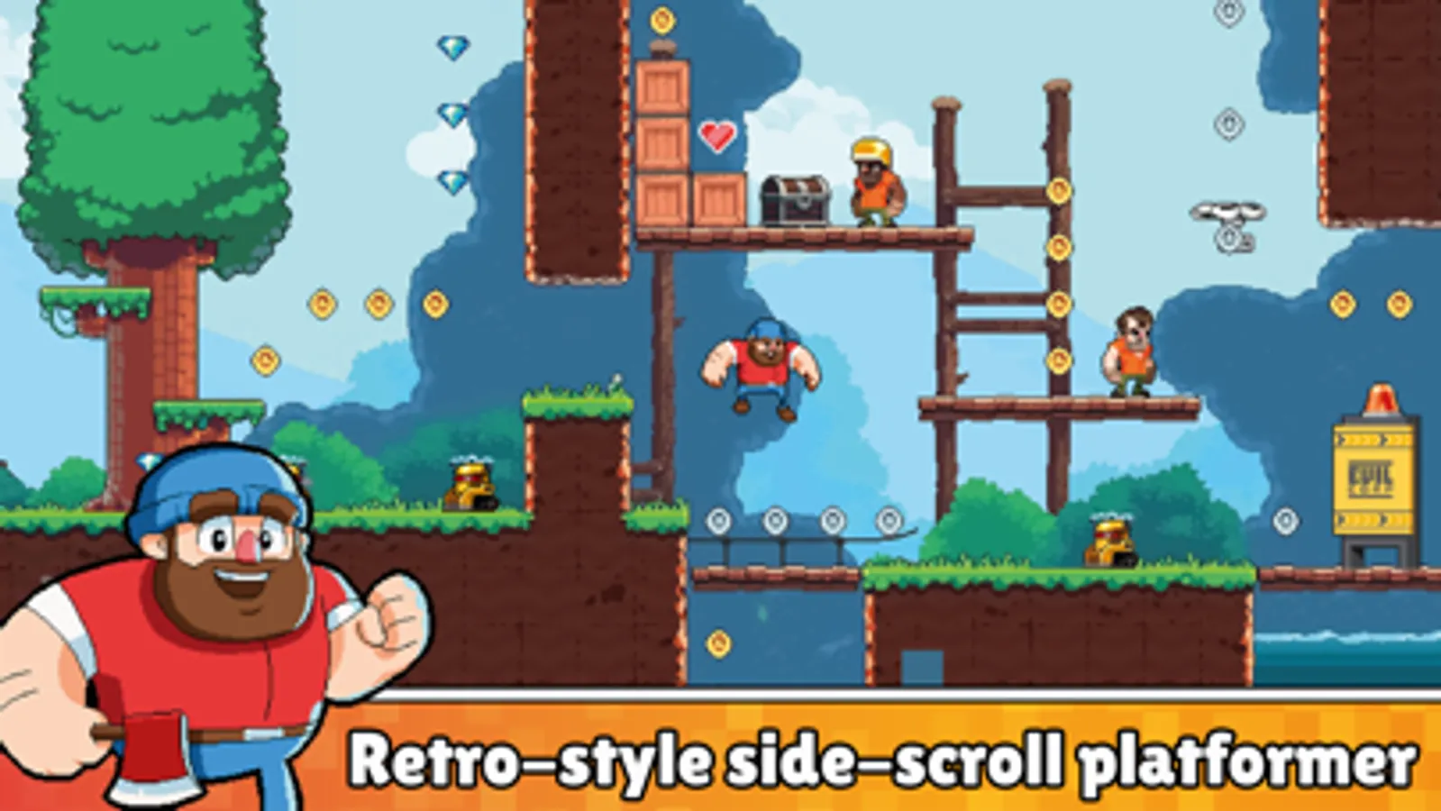 Follow our brave lumberjack on his quest to rescue his friends and save the forest from the Evil Corp. Defeat hordes of enemies, solve puzzles, chop wood and construct various structures to help you complete challenging levels. Find secret treasures, unlock mini games, battle bosses and many more!