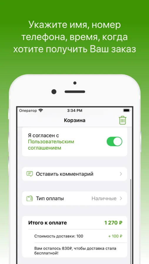 Укажите время, когда хотите прийти за своим заказом или выберите доставку с указанием времени и адреса доставки.