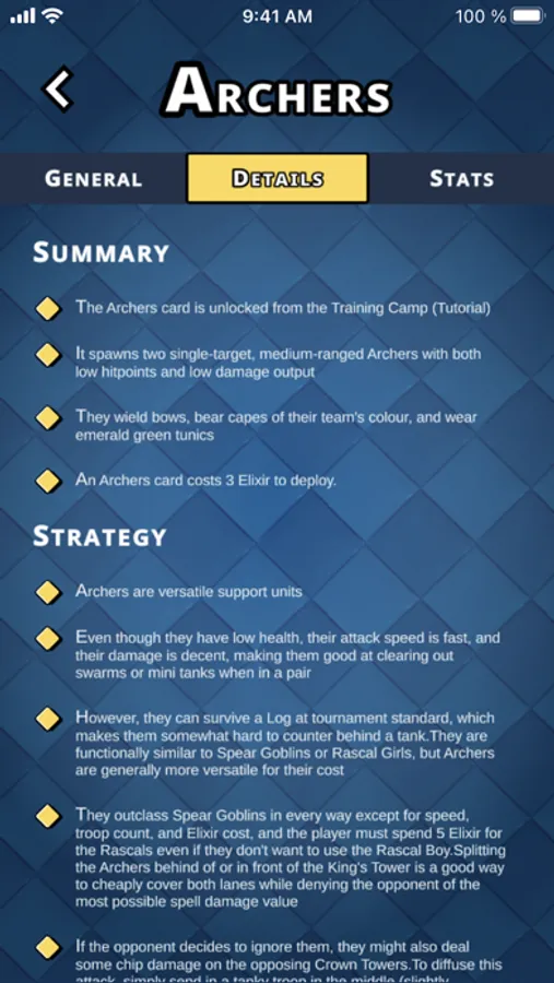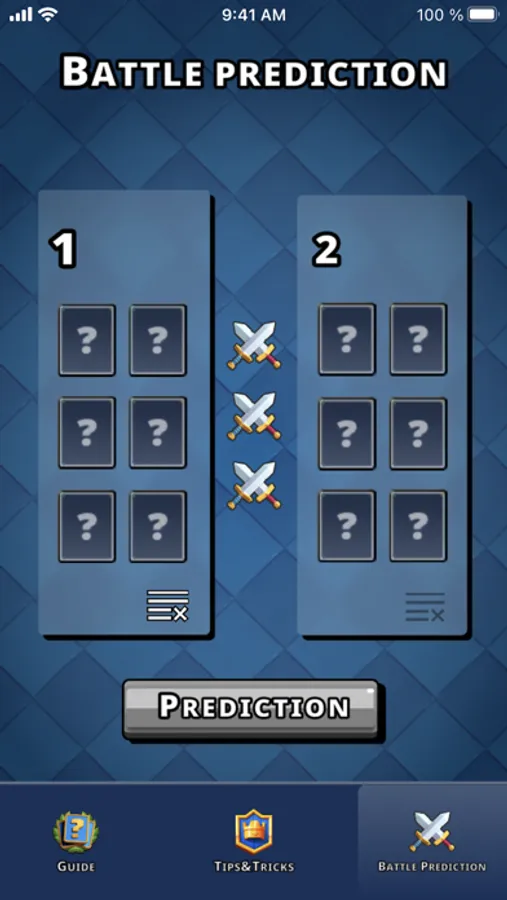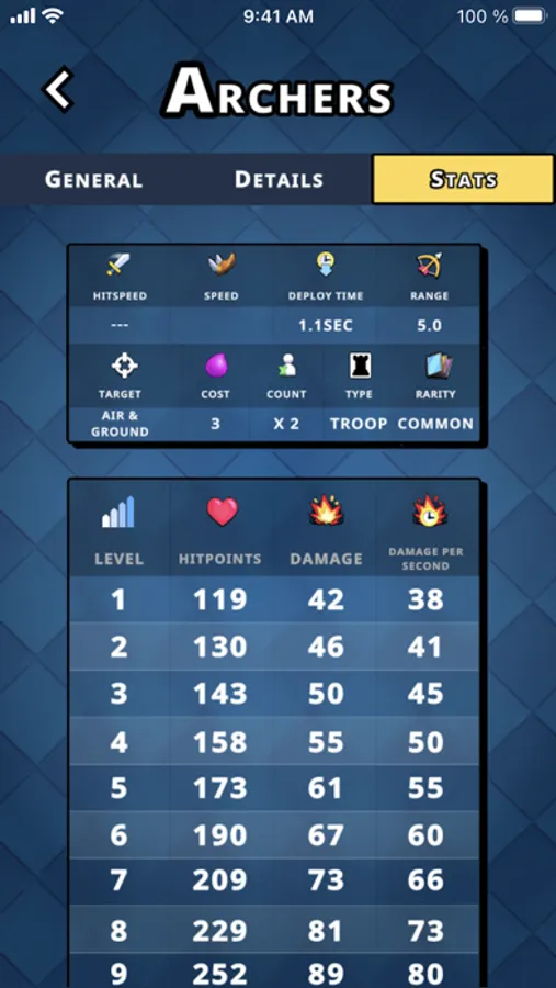 This application allows you to pick cards and check your winning percentage. You can predict battles and share results with your friends easily. This application allows you to view statistics for different cards like troop cards, spell cards, and building cards. Detailed information is provided for each card, so you can never go wrong. You can view details about who you can counterattack and who can counterattack you. Statistics provide details about levels, high points, damage, and damage per second. The basics section describes all the principles of the game, while the gameplay describes all the other elements of the game.