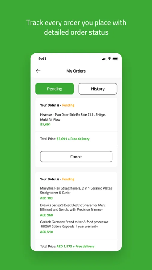 The app also includes a detailed status page where you can see all of your orders at a glance.