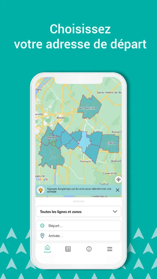 - Saisissez un arrêt, un lieu public, une adresse ou sélectionnez sur la carte votre point de départ et d’arrivée.