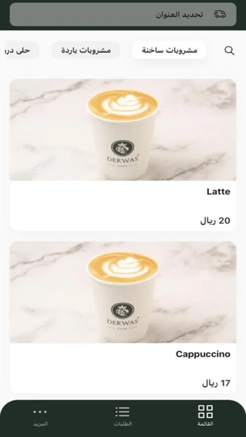 • عرض قائمة الأطعمة والمشروبات الخاصة بدرواس.