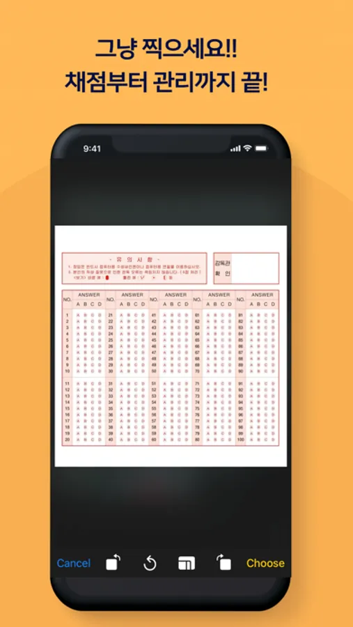 1. OMR 답안지에 답안을 마킹하여 인앱 카메라로 촬영하면 채점결과를 바로 분석리포트로 확인할 수 있습니다.