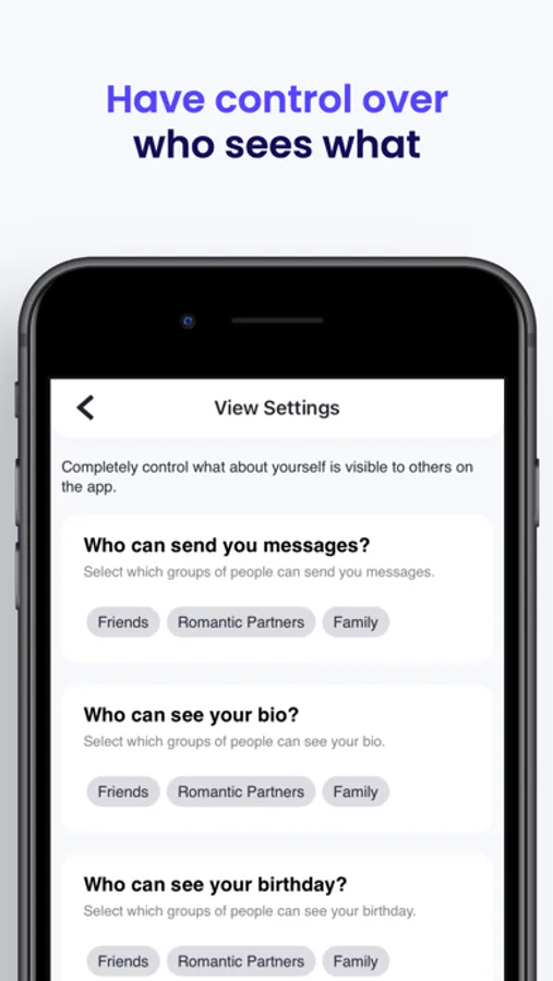 Privacy plays a central role on Keep It Alive. Users can have different kinds of relationships with others (acquaintances, friends, romantic partners, family, professionals), and can choose what about them is shown to each group as well as who can send them messages, and so much more.