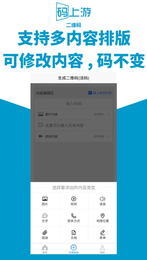 可把视频、图片、语音和地理位置等各种信息生成二维码,扫码就可以查看,各种内容可以混合后进行简单排版,生成的码长期有效。