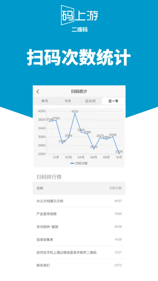 可对扫码进行统计,每天有多少人扫,每个月有多少扫都有详细统计曲线图,扫码次数有排行榜查看哪个码扫得最多 。