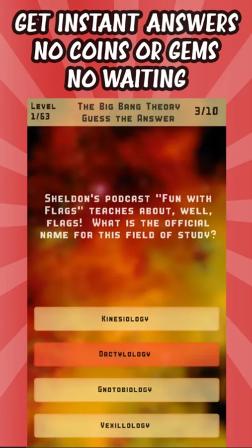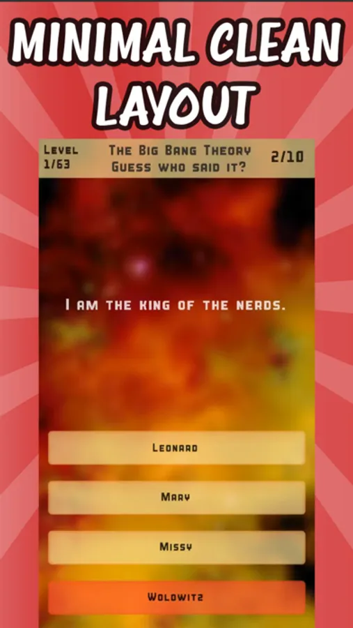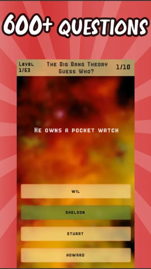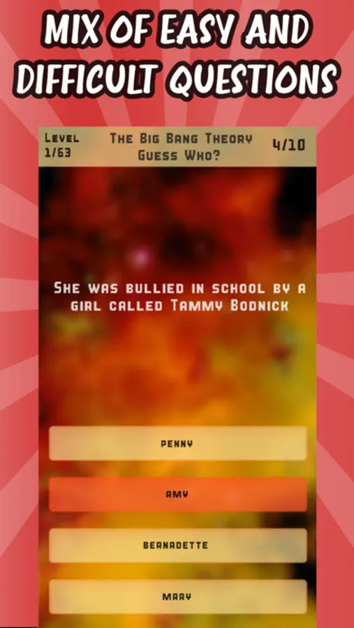 Are you a fan of "The Big Bang Theory"? Put your knowledge to the test with "The Big Bang Theory Quiz"! In this fun and challenging game, you'll be tested on your knowledge of the hit TV show, its characters, and its iconic moments. From Sheldon's quirky personality to Leonard and Penny's will-they-won't-they relationship, there's something for every fan of the show. Can you earn a high score and prove that you're the ultimate "Big Bang Theory" trivia master? Play "The Big Bang Theory Quiz" and find out! Whether you're a casual viewer or a die-hard fan, this game is sure to provide hours of entertainment and test your knowledge of all things "Big Bang Theory". So gather your friends and see who among you is the ultimate expert on this beloved TV show.