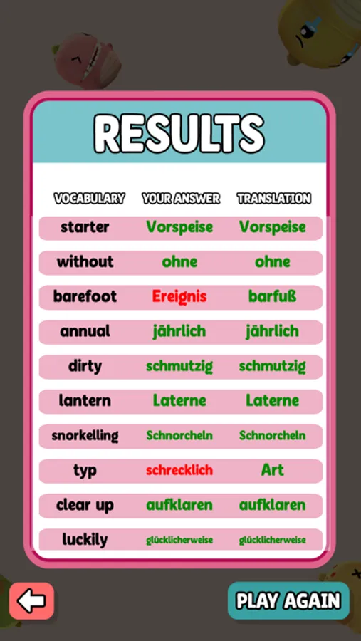 Mit Monster Swipe Vocabulary kannst du schnell und einfach Englisch-Vokabeln lernen. Überprüfe dein Wissen und erweitere deinen Wortschatz zu den unterschiedlichsten Themengebieten. Miss dich online mit deinen Freunden und sichere dir deinen Platz in der Bestenliste. Dieses Quiz ist an den Lehrplan österreichischer und deutscher Schulen angepasst. Wähle einfach deine Schulstufe und los geht’s! Keine Werbeanzeigen, kein Tracking und absolut kostenfrei.
