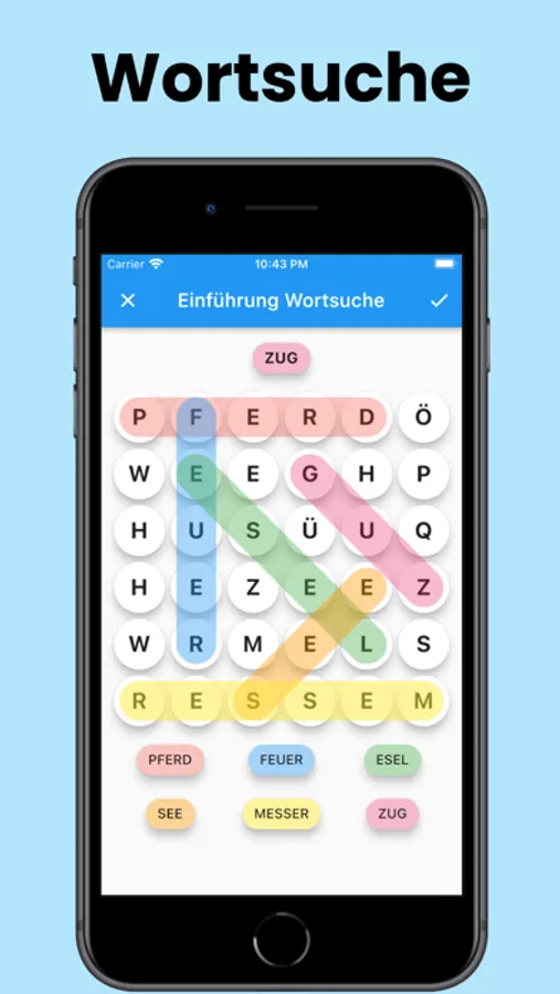 Beim Spiel Wortsuche sind mehrere Wörter in einem Feld voller Buchstaben versteckt. Ziel des Spiel ist es alle angegebenen Wörter zu finden. Wörter können horizontal, vertikal, diagonal und auch rückwärts geschrieben sein.