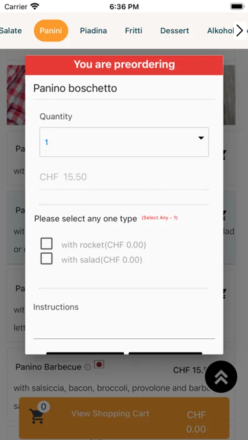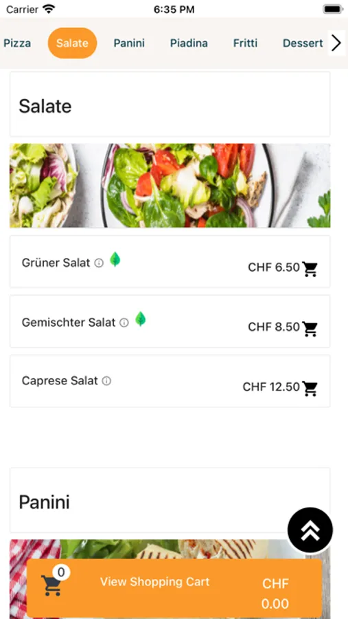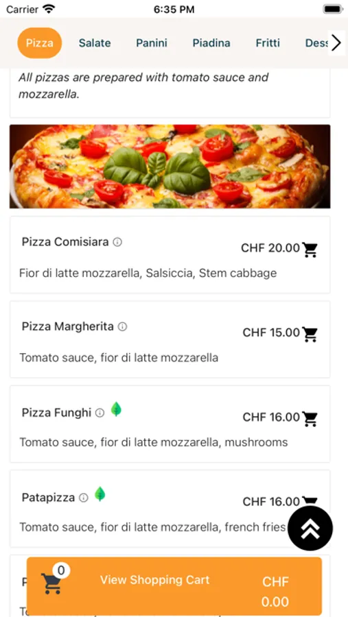 The types of food are: Pizza, Salate, Panini, Piadina, Fritti, Dessert, etc.