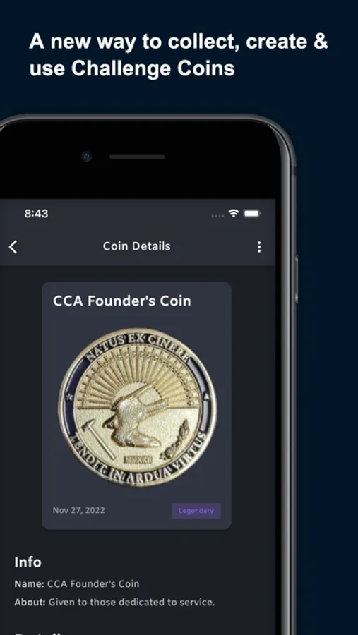 Utilize the Challenge Coin App to create custom Challenge Coins and digitally store your collection for display and safe keeping.