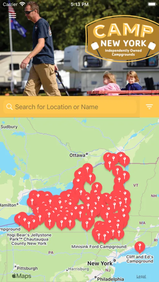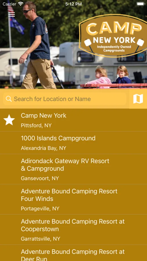 Download the free CAMP NEW YORK mobile app, to access up-to-date information on independently owned campgrounds and RV parks in the vacation regions across New York State. Our parks host thousands of RV sites, tent sites, and on-site rentals including cabins, cottages, RV units, yurts, and glamping tents. They are located close to many of the iconic destinations and attractions you want to visit, from Niagara Falls to the Adirondacks, in the Finger Lakes, up to the 1000 Islands, down into the Catskills and Hudson Valley, and all the way to the eastern shores of Long Island.