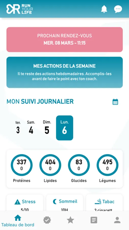 - Un journal quotidien qui permet de renseigner tes données : macros, sommeil, stress, tabac, compléments alimentaires, suivi de l’évolution du poids et mesures