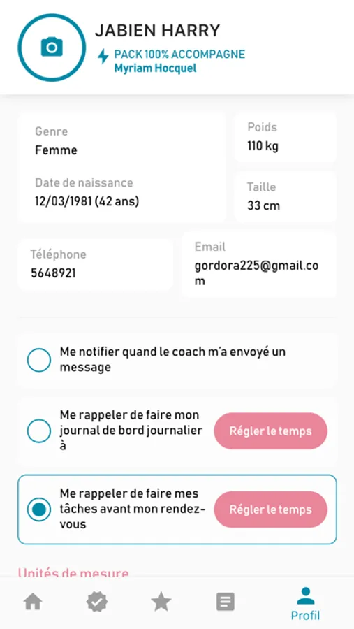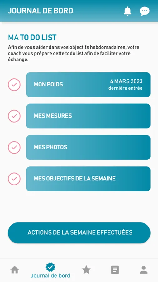 - Un journal hebdomadaire : consulter les ressources et objectifs de votre coach, ajuster vos macros de la semaine, renseignez vos mesures et votre poids chaque semaine