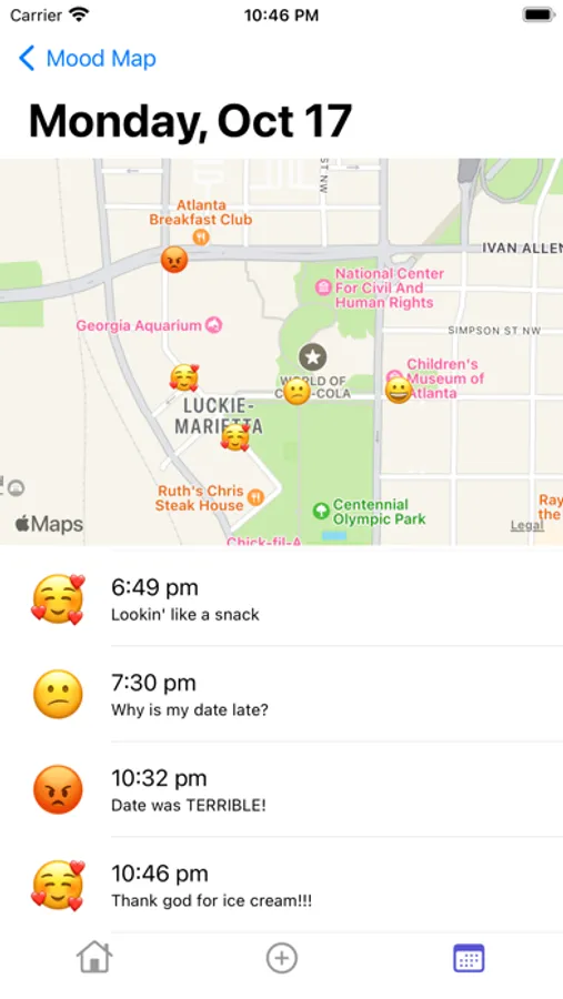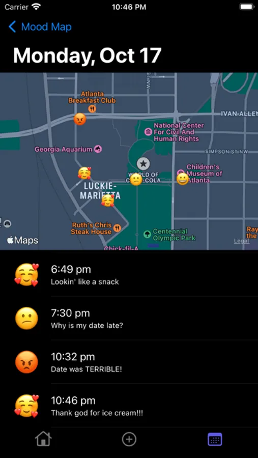 Each mood entry automatically pins your mood on a map so you can see HOW your moods change from one place to the next.